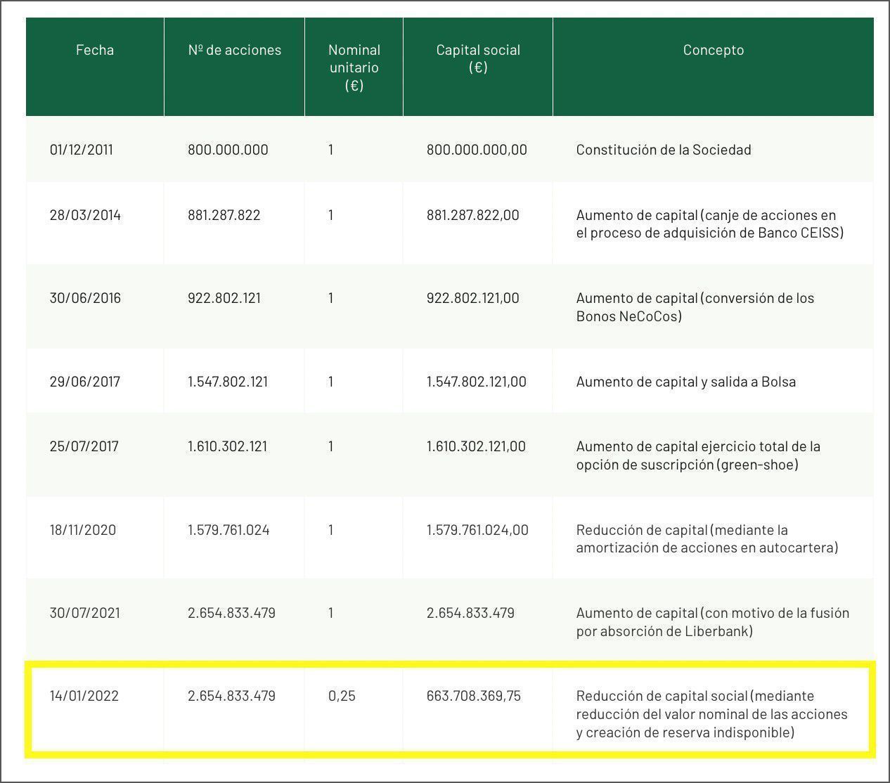 En la siguiente imagen podemos ver cómo en el caso del banco Unicaja hubo una primera emisión de 800 millones de acciones de 1 euro, posteriormente se fue ampliando la cuantía con fusiones o compensaciones de CoCos (Bonos contingentes convertibles) y en época más reciente se produjo una reducción de capital pasando de 1 € de valor nominal la acción a 0,25 € de valor nominal: