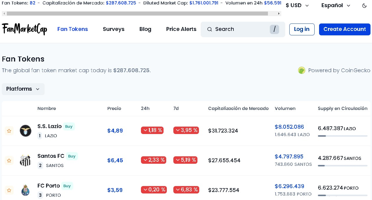 FanMarketCap, por ejemplo, maneja una variedad de 82 fan tokens, los cuales tienen una capitalización de mercado total de más de 287 millones de dólares.