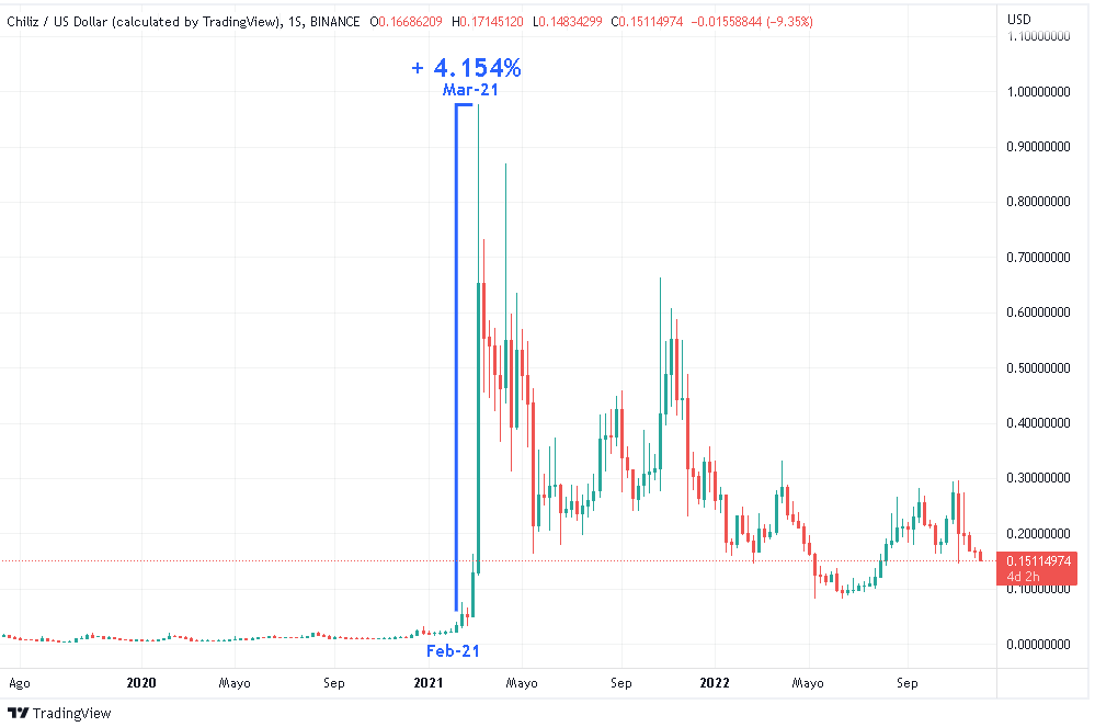 Entre febrero y marzo de 2021, en pleno auge de los mercados bursátiles y de criptomonedas gracias a la recuperación económica postpandémica y a las políticas monetarias superexpansivas, el token de Chiliz experimentó un aumento de 95 centavos de dólar en apenas 5 semanas.