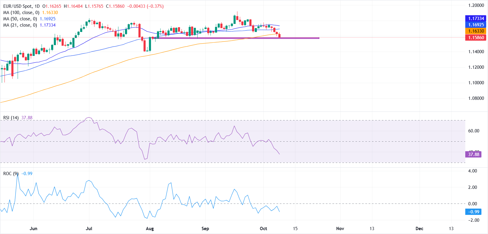 Técnicamente, el EUR/USD se ha vuelto decididamente bajista desde que alcanzó un máximo de 1.1918 el 17 de septiembre, formando una clara secuencia de máximos y mínimos más bajos. El par se está negociando por debajo de sus medias móviles simples (SMA) de 21 días, 50 días y 100 días en 1.1735, 1.1692 y 1.1633, respectivamente, reforzando la tendencia a la baja.