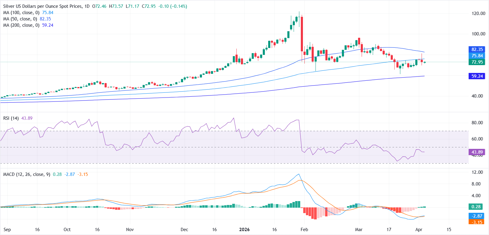 Desde una perspectiva técnica, el XAG/USD mantiene una perspectiva bajista a neutral, con rechazos repetidos cerca de la media móvil simple (SMA) de 100 días y el precio manteniéndose bien por debajo de la SMA de 50 días.