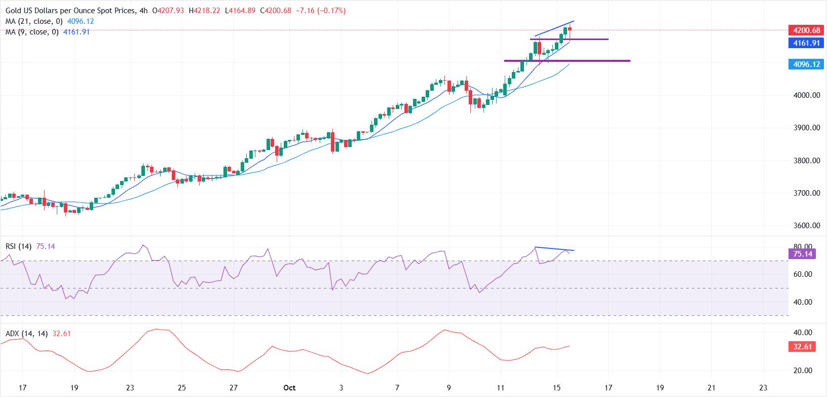 Al momento de escribir, el XAU/USD se encuentra alrededor de 4.200$, subiendo casi un 1.4% en el día después de alcanzar un nuevo máximo histórico de 4.218$ más temprano en la sesión europea.