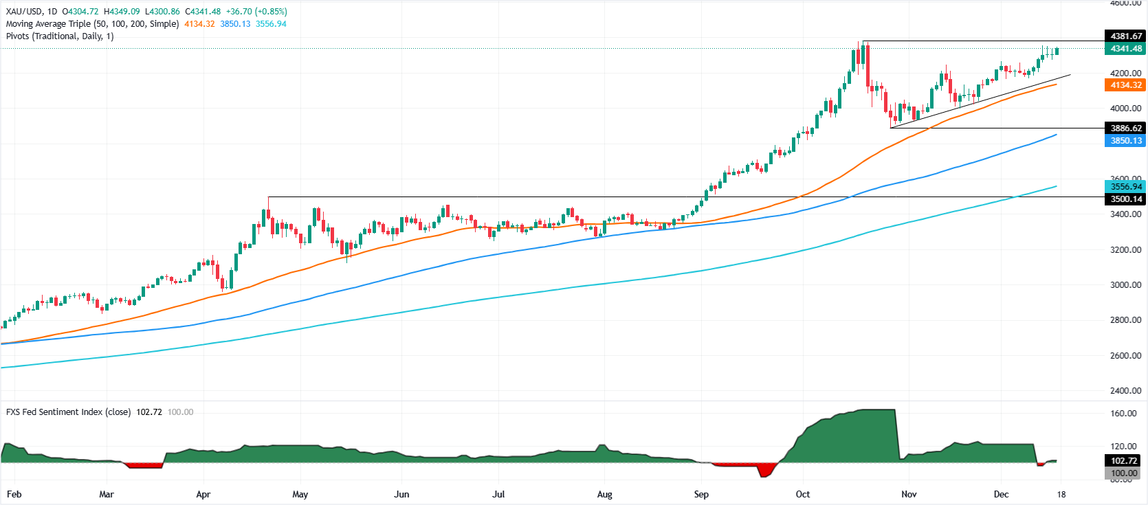 Por el contrario, la caída del oro por debajo de $4,300, el máximo del 11 de diciembre convertido en soporte, está próxima en $4,285, con un soporte adicional en $4,250 antes de un retroceso más profundo hacia $4,200.