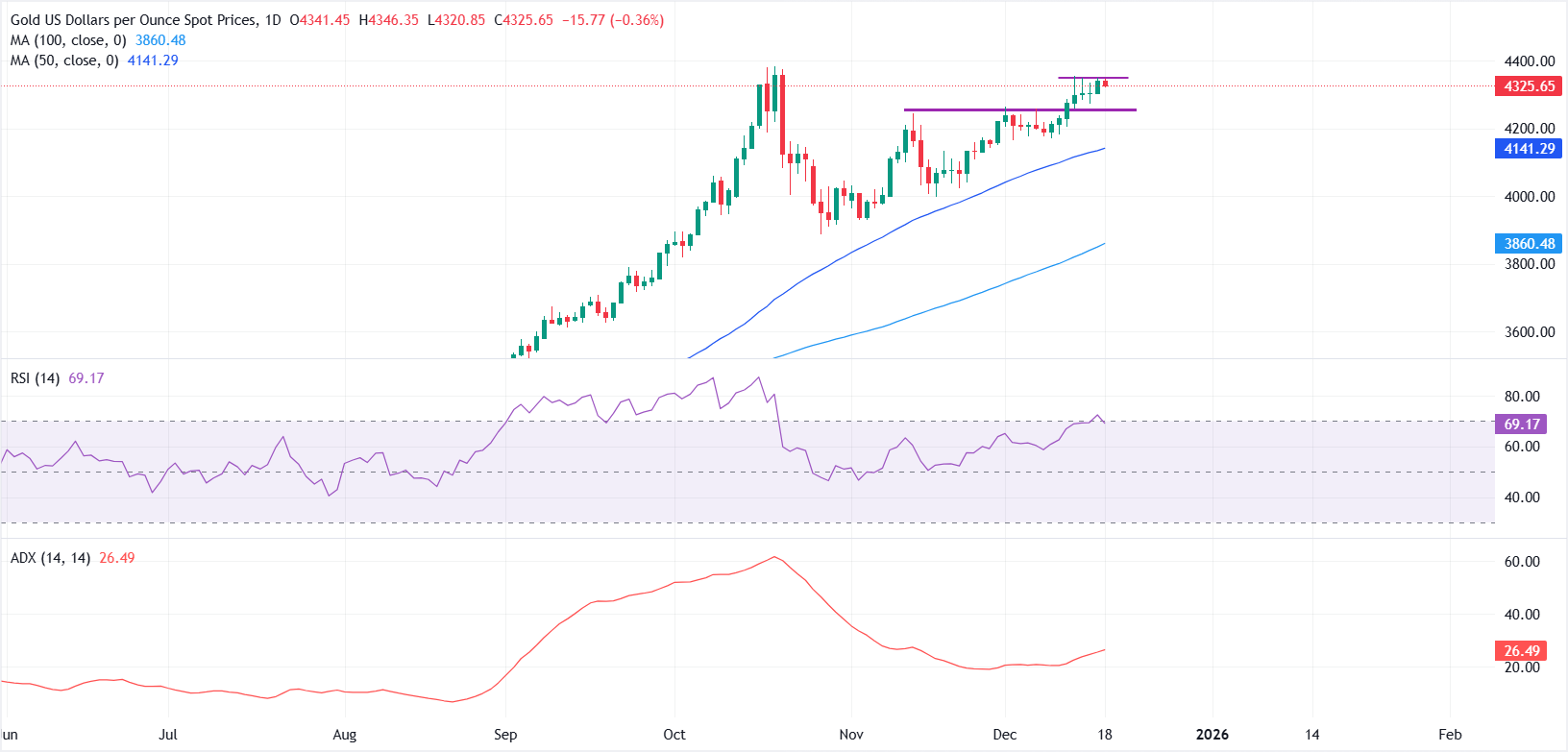 En el marco de tiempo diario, la media móvil simple (SMA) de 50 días se eleva por encima de la SMA de 100 días, con ambas pendientes avanzando y el precio manteniéndose por encima de ellas, preservando un sesgo alcista. La SMA de 50 días se sitúa actualmente en 4.141,31$, ofreciendo soporte dinámico cercano. El Índice de Fuerza Relativa (RSI) se reduce a 69 desde 72, justo por debajo del nivel de sobrecompra, lo que sugiere que el impulso alcista se enfría pero sigue siendo firme.