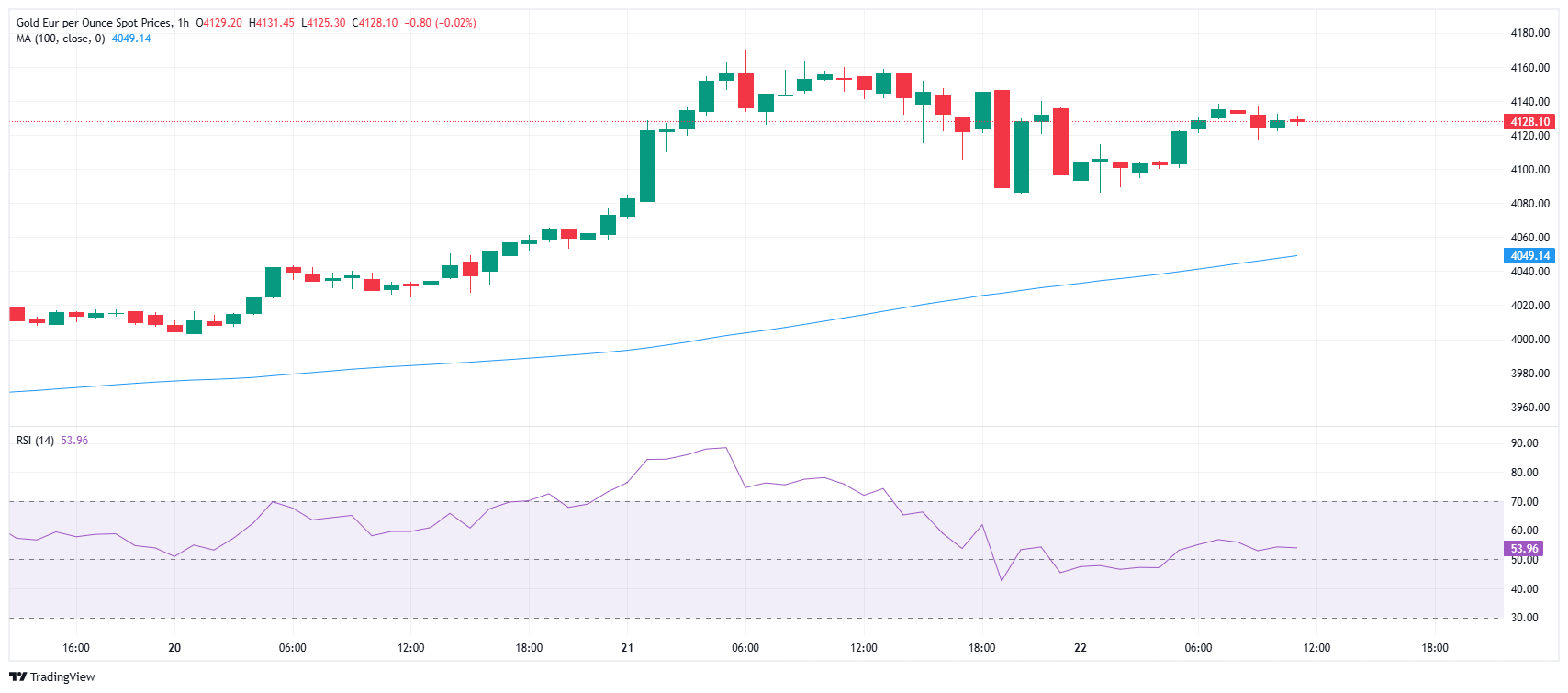 La onza de Oro en euros ha caído en las primeras horas del jueves a un mínimo diario de 4.086€, pero posteriormente ha subido a un máximo del día en 4.140€. Al momento de escribir, el XAU/EUR cotiza sobre 4.127,00€, perdiendo un leve 0.02% en el día.