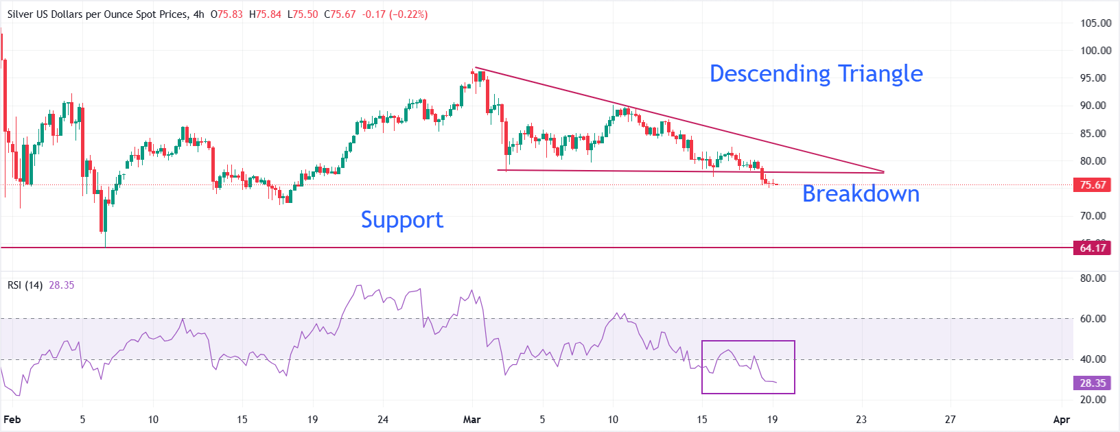 En el gráfico de 4 horas, el XAG/USD parece estar en una tendencia bajista tras una ruptura del patrón gráfico de triángulo descendente cerca de 77.50$. El desplazamiento del Índice de Fuerza Relativa (RSI) de 14 períodos hacia la zona de 20.00-40.00 señala el inicio de un fuerte impulso bajista.