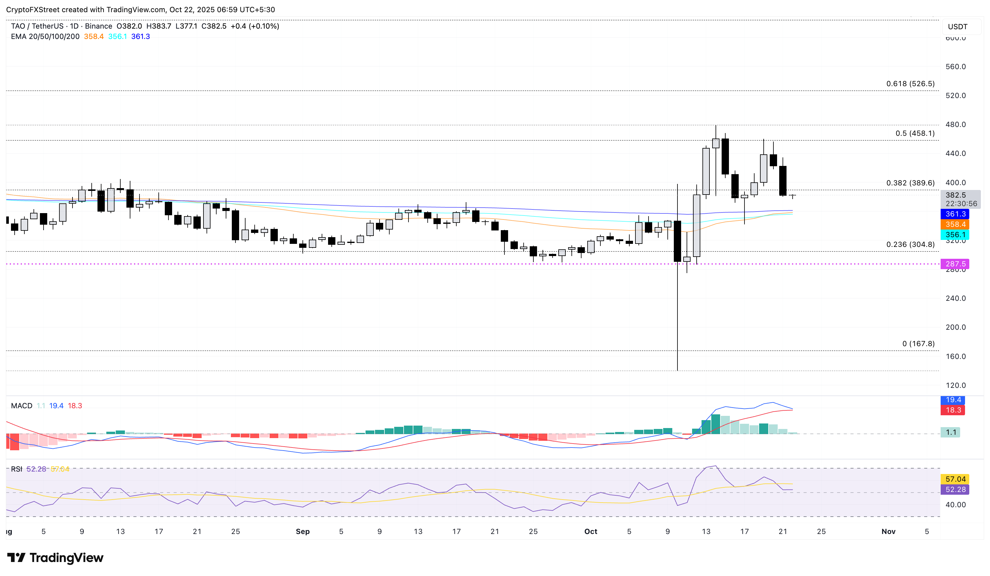 Si TAO rebota en la EMA de 200 días en 361$, podría enfrentar el hito de 400$ y el nivel de 458$ como resistencias superiores.
