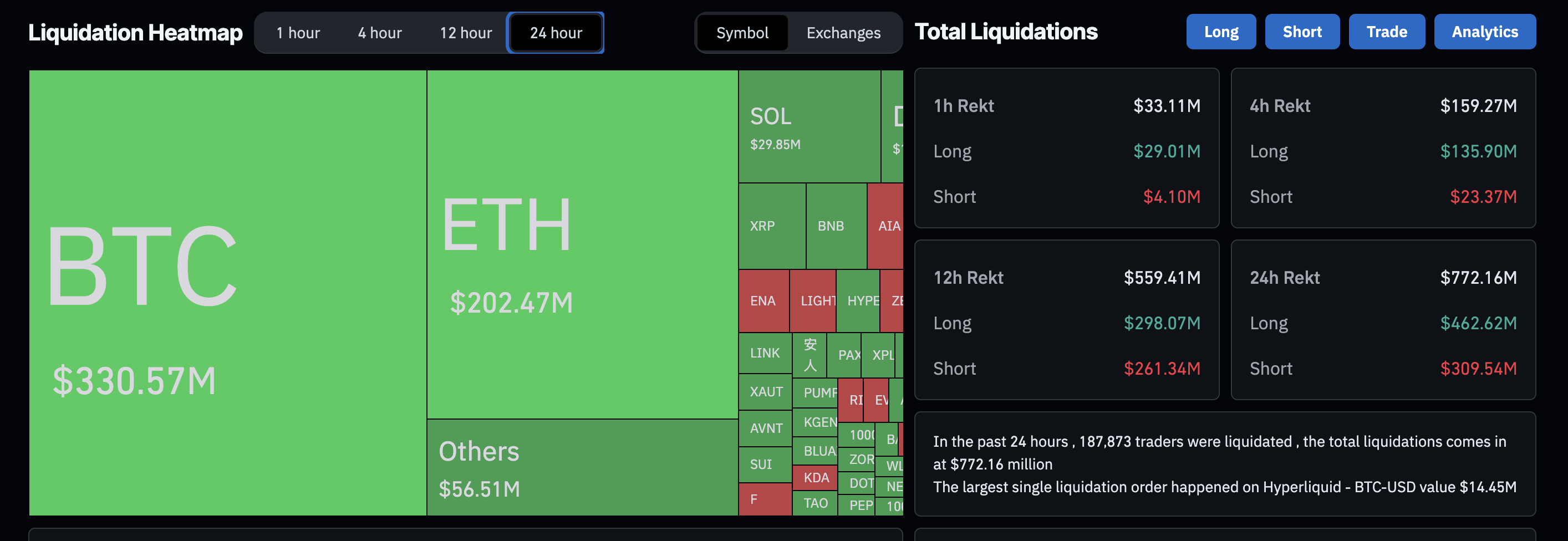 Las olas de picos de liquidación elevados, principalmente liquidaciones largas, en el mercado de criptomonedas subrayan la creciente volatilidad y el dominio bajista. Los datos de CoinGlass muestran que 772 millones de dólares en contratos abiertos sufrieron liquidación forzada en las últimas 24 horas, con 62.62 millones de dólares en liquidaciones largas superando a 309.54 millones de dólares en pérdidas por liquidaciones cortas.