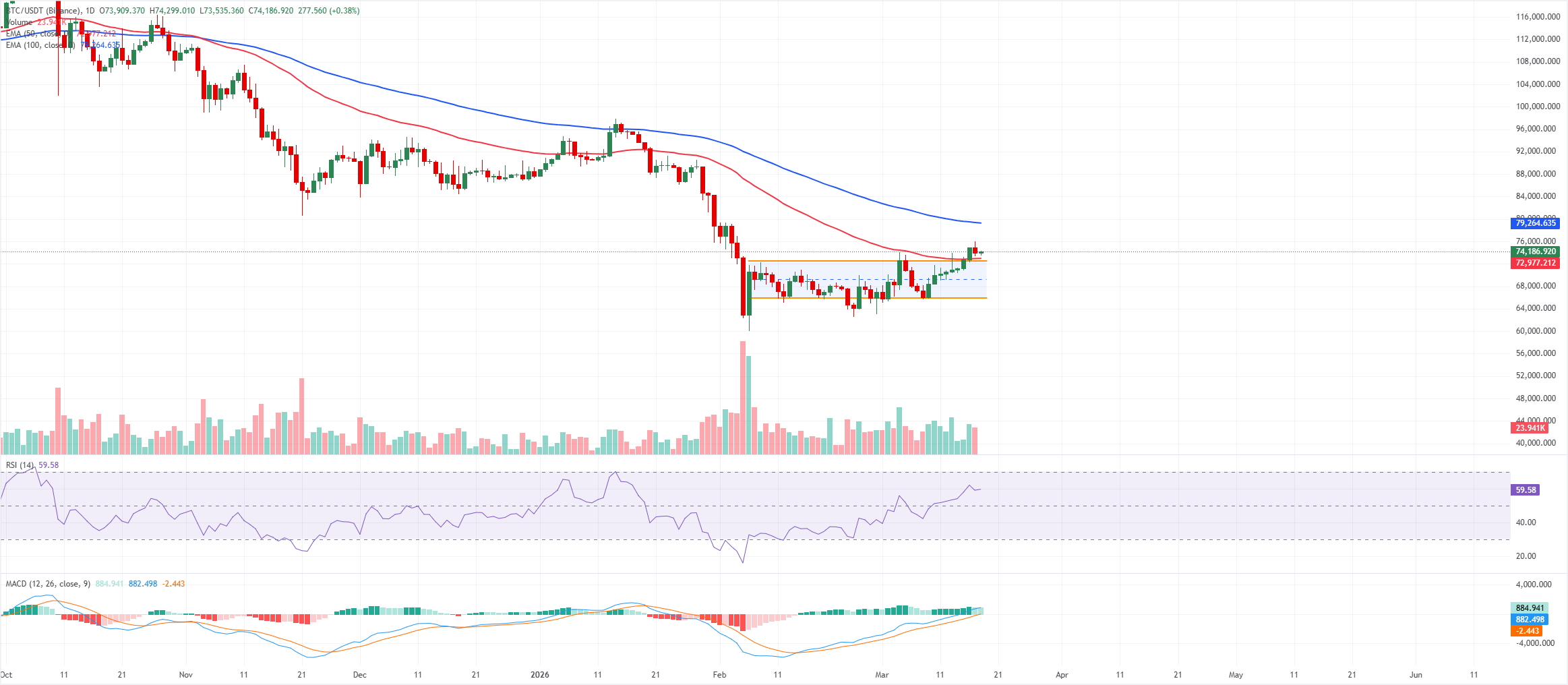 El soporte inicial surge cerca de la antigua parte superior del canal alrededor de 72.600$, donde cualquier retroceso pondría a prueba el área de ruptura, seguido de un soporte más fuerte en la EMA de 50 días cerca de 73.000$ y luego la banda inferior de la congestión reciente alrededor de 71.000$. Un deslizamiento más profundo expondría la base del canal y el área de oscilación reciente alrededor de 65.900$.