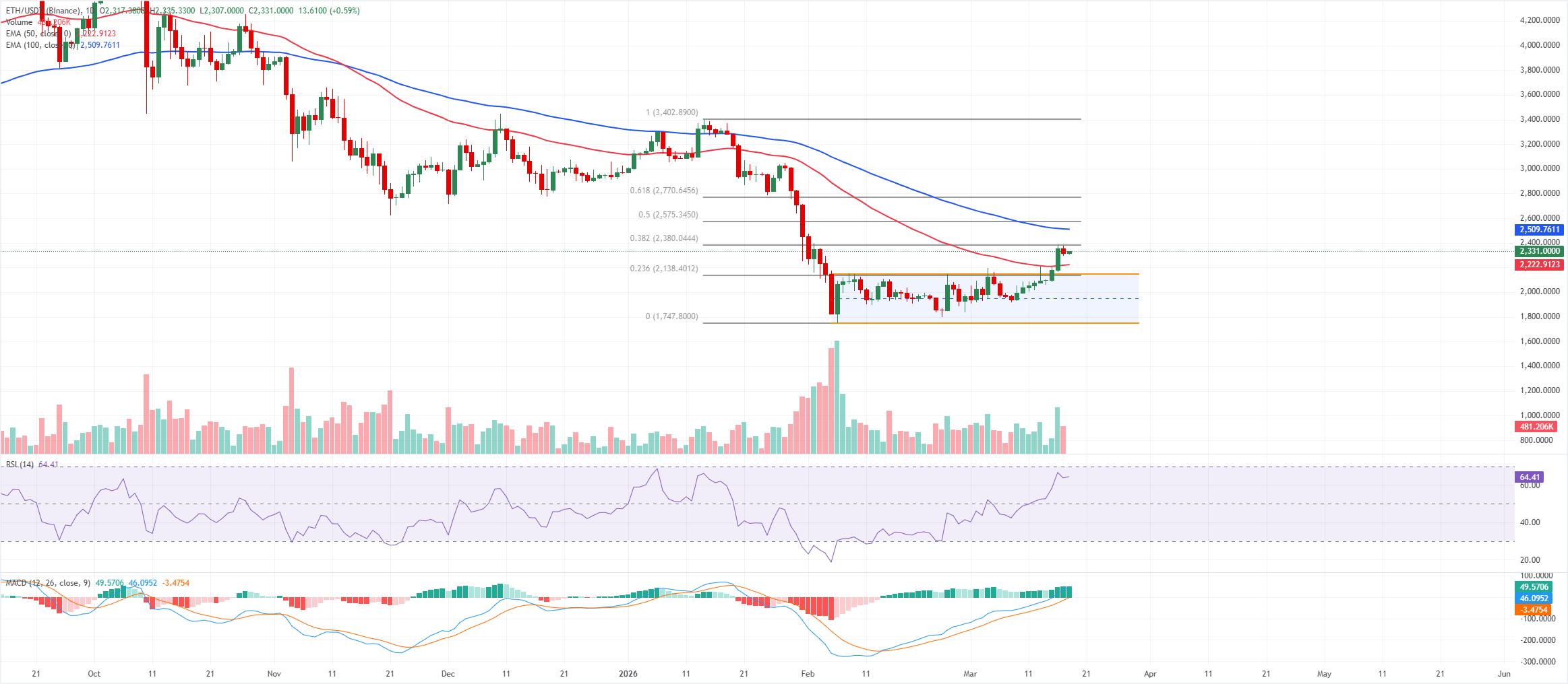 El precio de Ethereum se cotiza a 2.300$ el miércoles, después de cerrar por encima de el límite superior del canal cerca de 2.148$ el domingo. ETH ha recuperado el retroceso de Fibonacci del 23.6% en 2.138$, medido desde el mínimo de 1.747$ hasta el máximo de 3.402$. El precio ahora se mantiene por encima de la EMA de 50 días en 2.223$, mientras que la EMA de 100 días en 2.510$ aún se cierne bien por encima, manteniendo la tendencia más amplia bajo presión.