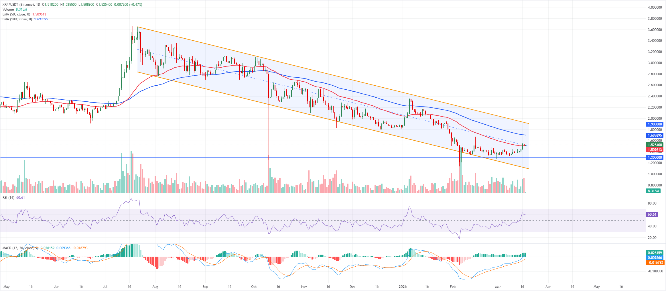 En el lado positivo, la resistencia inmediata se sitúa en la EMA de 100 días en 1.70$. Un cierre diario por encima de esa banda abriría el camino hacia la resistencia horizontal de 1.90$, que se alinea con la parte superior del canal y marca el nivel clave que los alcistas deben despejar para desafiar el patrón bajista dominante.