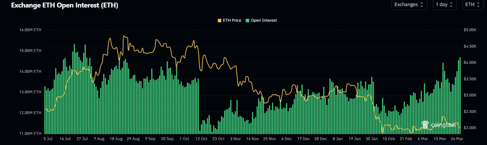 La exposición a derivados de ETH también crece de forma constante, alcanzando 14.72 millones de ETH, incluso cuando las tasas de financiación se inclinan a negativo con un pico el viernes.