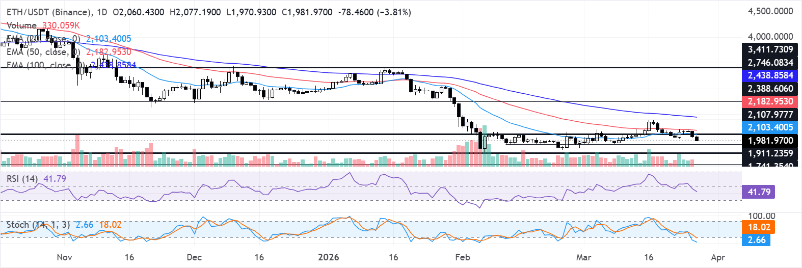 En el gráfico diario, ETH cotiza a 1.981$. El sesgo a corto plazo se ha vuelto ligeramente bajista ya que el precio cae por debajo de la Media Móvil Exponencial (EMA) de 20 días, mientras que las EMAs de 50 y 100 días, agrupadas muy por encima de 2.180$ y 2.430$, subrayan una fase correctiva más amplia.