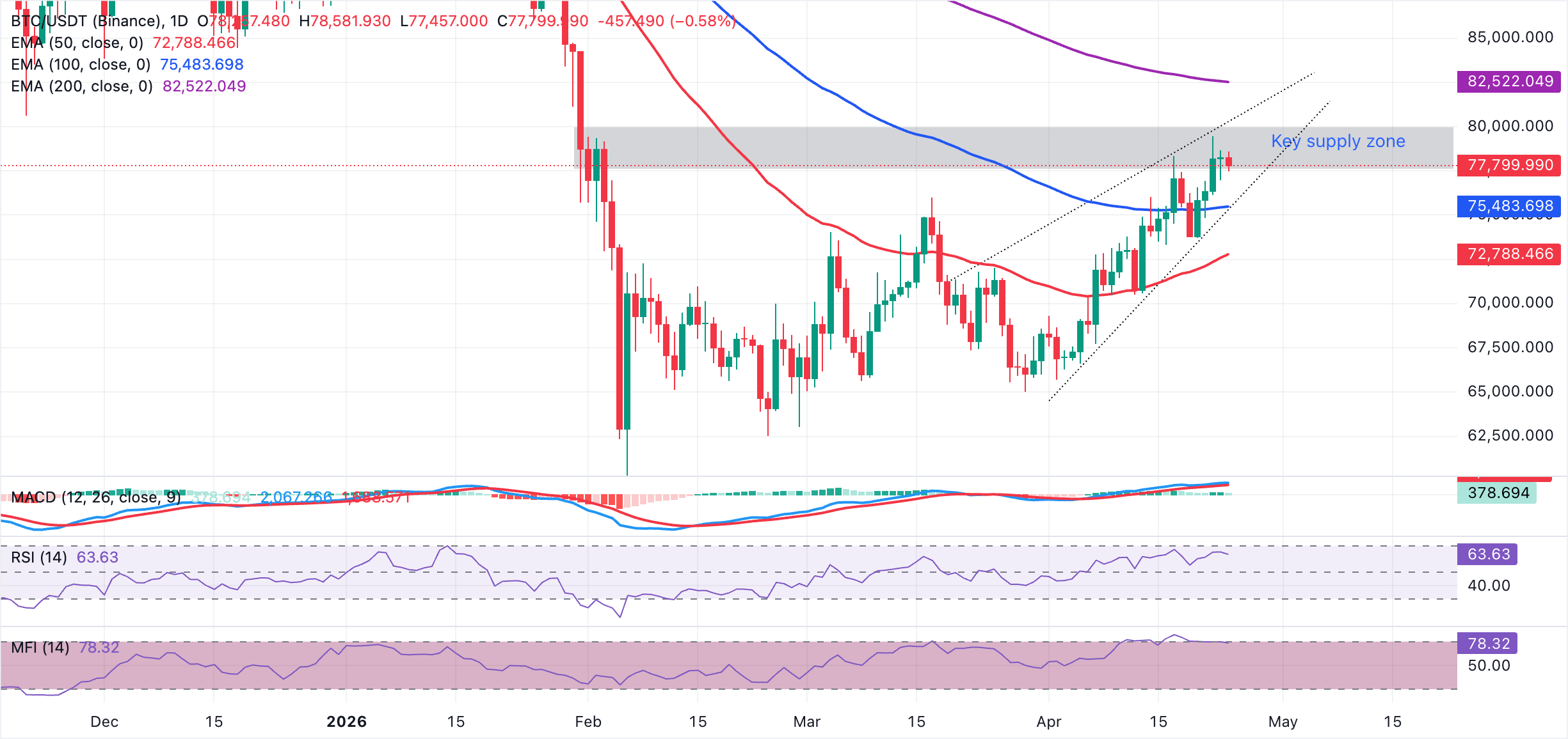 En el lado alcista, los próximos obstáculos notables son la zona de oferta inmediata en 78.000$, seguida por la EMA de 200 días en 82.522$. Ambos representan la primera resistencia mayor que los alcistas necesitarían superar para extender la tendencia alcista. A la baja, el soporte inicial está en 75.484$, donde la EMA de 100 días se encuentra con la línea de tendencia ascendente, antes de la EMA de 50 días en 72.788$.
