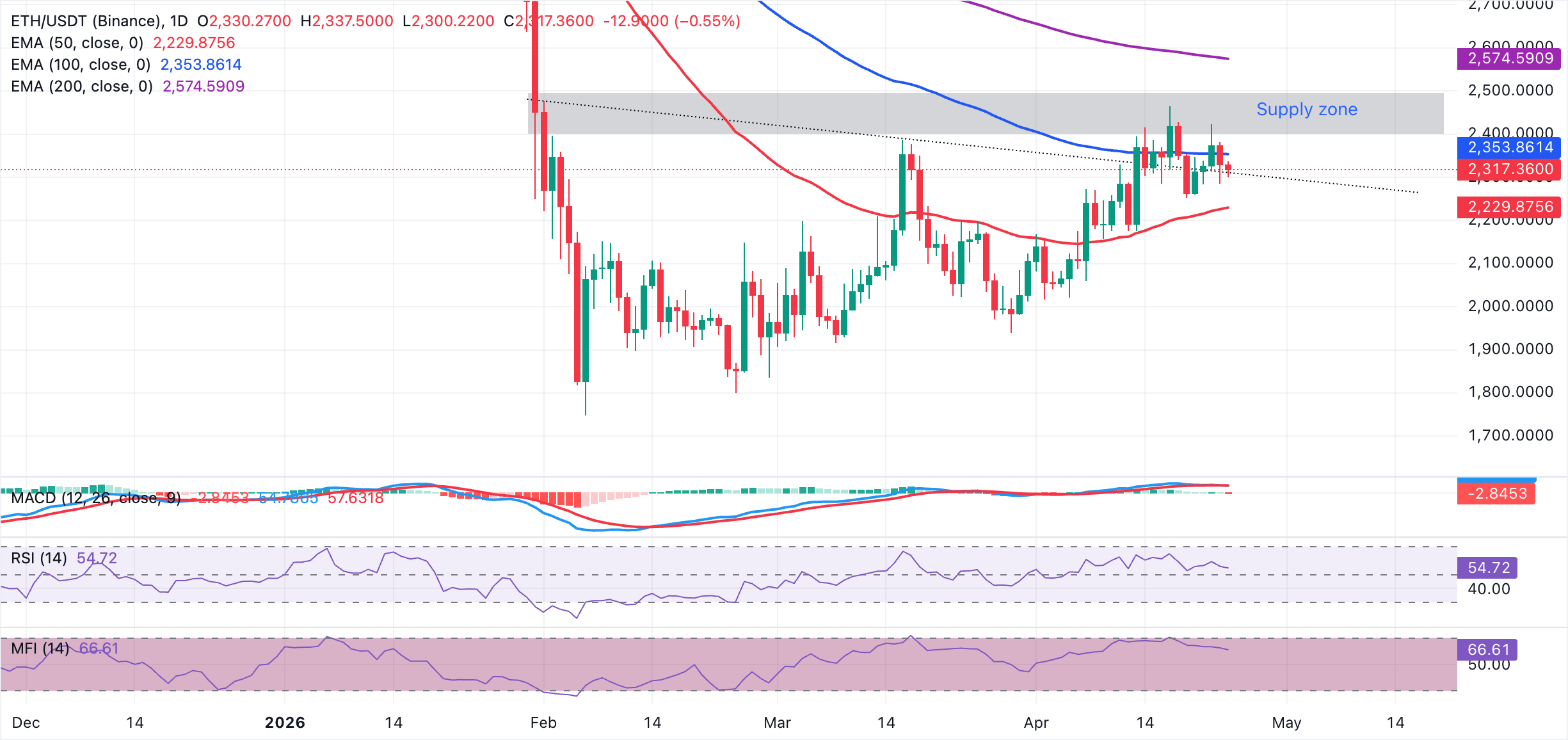 Ethereum cotiza a 2.317$, manteniéndose por encima de la EMA de 50 días en 2.230$ y la ruptura previa de la línea de tendencia bajista cerca de 2.310$, inclinando el sesgo a corto plazo ligeramente a favor de los alcistas mientras se consolida bajo niveles superiores más pesados. El RSI en 54 en el gráfico diario sugiere una presión positiva modesta. Sin embargo, el histograma del MACD ha caído a territorio negativo, lo que indica que los intentos alcistas pueden carecer de un seguimiento fuerte a menos que surja un nuevo interés comprador.