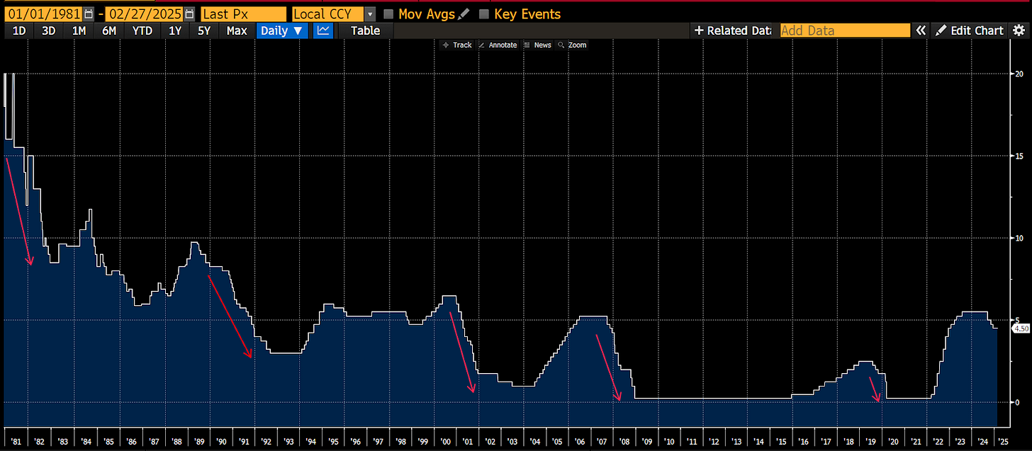 Arthur lo llama "matar al pollo para asustar al mono". Los despidos masivos envían un mensaje: el viaje gratis ha terminado. Cuanto más se asusta el mercado, más Powell siente presión para reducir las tarifas e imprimir dinero. ¿Por qué? Cada recesión de los Estados Unidos desde 1980 ha llevado a recortes de tasas. Arthur tira de las listas históricas: