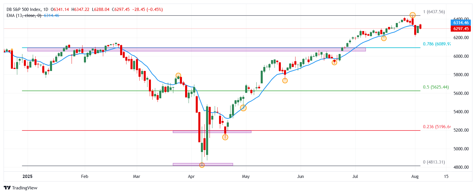 El S&P 500 reaccionó a la baja desde máximos del 31 de julio en 6.347, encontrando vendedores agresivos que arrastraron el índice a un mínimo diario en 6.288. Al momento de escribir, el S&P 500 cotiza en 6.297, perdiendo un 0.45% en la jornada del martes.