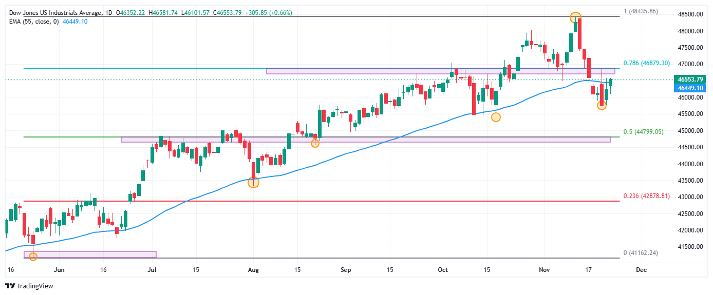 El Dow Jones marcó mínimo diario en 46.101, donde atrajo compradores agresivos que llevaron el índice a máximos del 20 de noviembre en 46.581.
