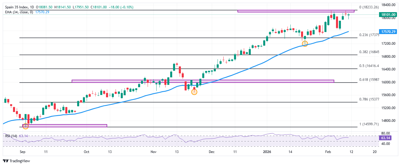 El Ibex 35 formó un soporte de corto plazo en 17.191, mínimo del 21 de enero. El siguiente soporte importante lo observamos en 15.682, punto pivote del 21 de noviembre de 2025. Al alza, la resistencia más cercana se encuentra en 18.219, máximo histórico alcanzado el 3 de febrero.