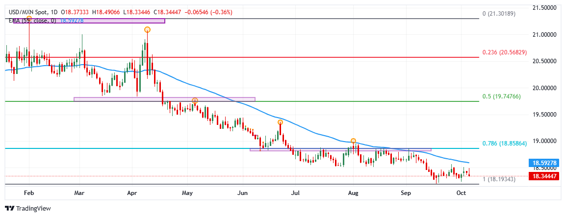 El USD/MXN reaccionó a la baja desde máximos del 2 de octubre en 18.4906, encontrando vendedores agresivos que llevaron la paridad a mínimos del 1 de octubre en 18.3346. Actualmente, el precio del Dólar estadounidense opera en 18.3403 frente al Peso mexicano, cayendo un 0.36% diario.