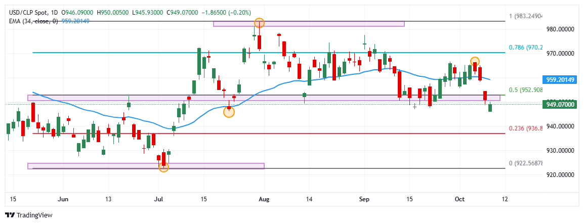 El USD/CLP registró un máximo del día en 949.85, atrayendo vendedores que llevaron el índice a mínimos de tres meses en 945.93. En estos momentos, el USD/CLP cae un 0.22% diario, operando en 949.860.