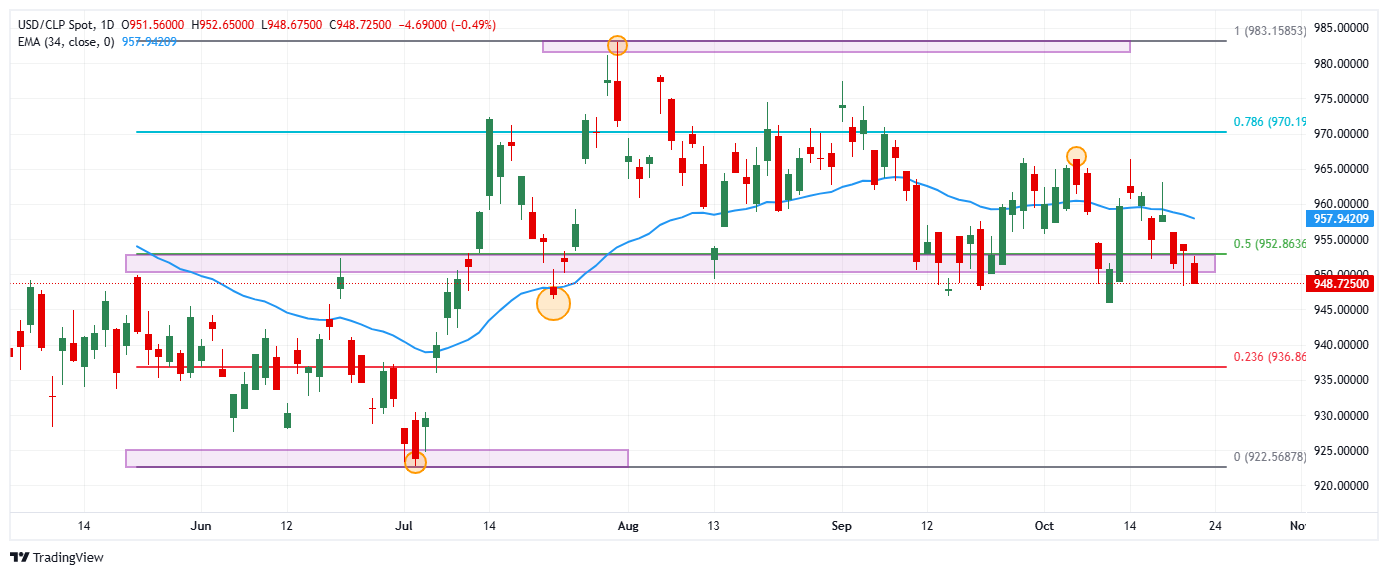 El USD/CLP estableció un máximo del día en 952.21, encontrando vendedores que llevaron la paridad a un mínimo diario en 951.18. Actualmente, el USD/CLP se desliza un 0.49% el día de hoy, cotizando sobre 948.71.