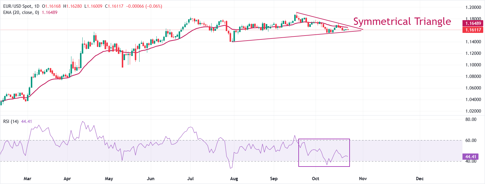 El EUR/USD cotiza en un rango estrecho ligeramente por encima de 1.1600 durante la última sesión de negociación europea del viernes. El par de divisas principal demuestra una tendencia lateral más amplia en medio de la formación de un patrón gráfico de Triángulo Simétrico.