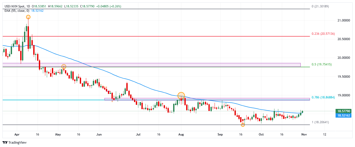 Ante este escenario de apreciación del Dólar, el Peso mexicano extiende su caída, mientras que el USD/MXN firma su cuarta jornada consecutiva al alza, manteniéndose dentro del rango operativo de la sesión anterior en 18.5780.