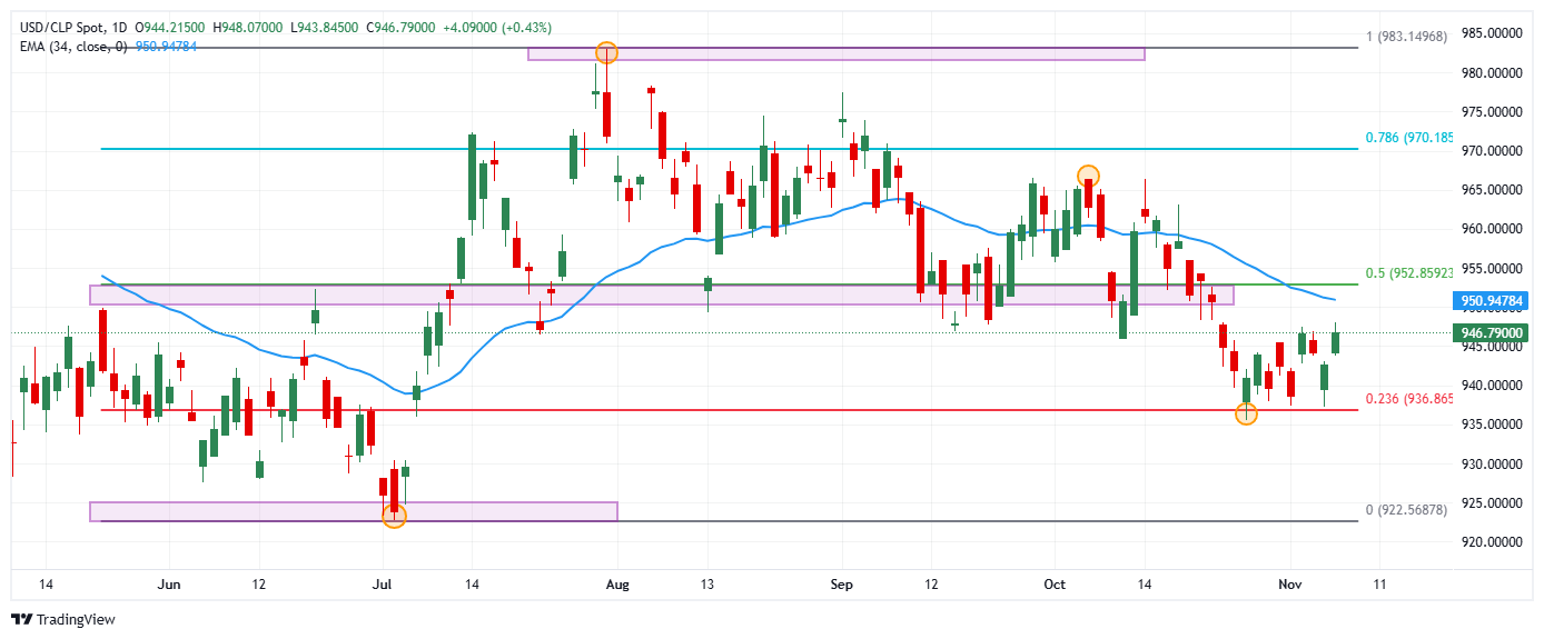 El USD/CLP registró un mínimo del día en 943.8450, encontrando compradores agresivos que impulsaron la paridad a máximos del 22 de octubre en 948.0700. Al momento de escribir, el USD/CLP opera en 946.7800, subiendo un 0.43% en la jornada del viernes.