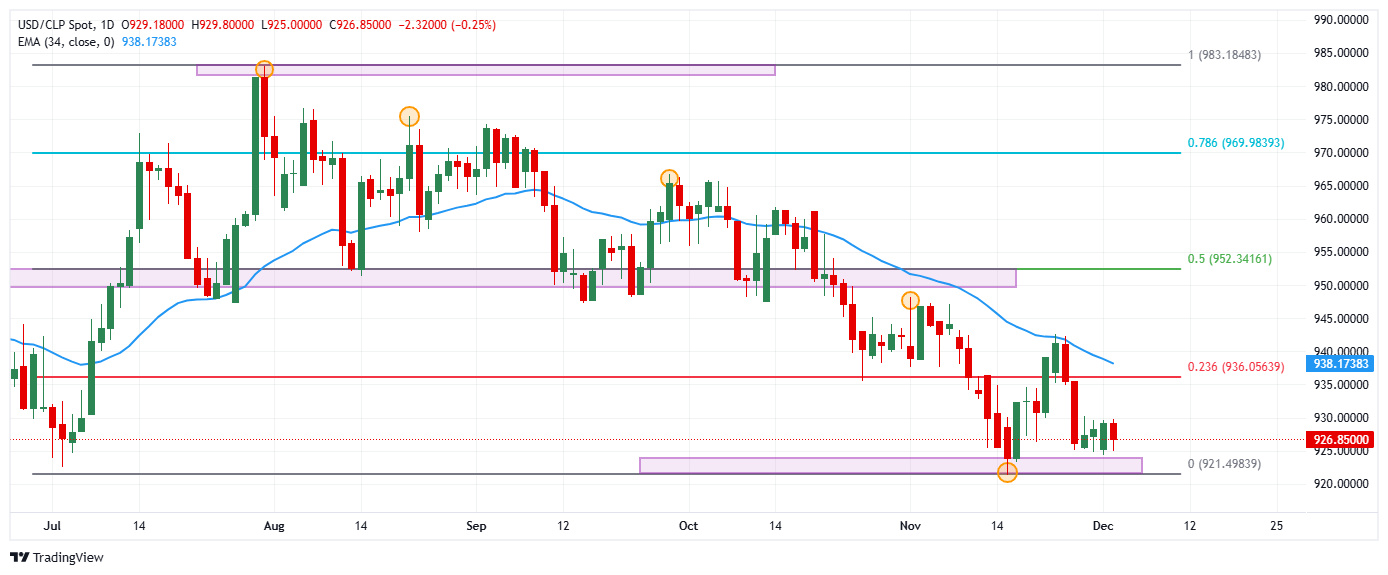 El USD/CLP estableció un máximo del día en 929.80, encontrando vendedores que llevaron la paridad a un mínimo diario en 925.00. Actualmente, el USD/CLP se desliza un 0.18%, cotizando sobre 926.93.