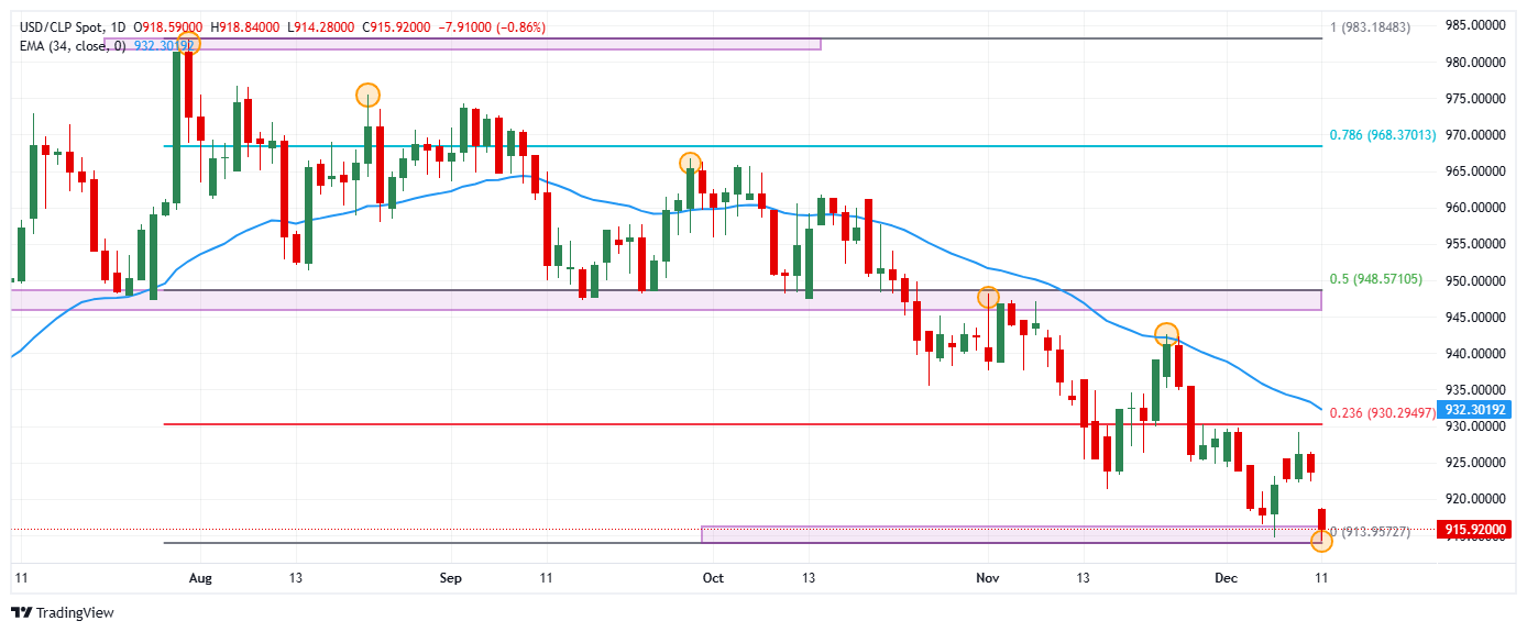 El USD/CLP estableció un máximo diario en 918.84, encontrando vendedores que llevaron la paridad a mínimos del 4 de octubre de 2024 en 914.28. Actualmente, el USD/CLP opera sobre 915.88, perdiendo un 0.84% en la jornada del jueves.