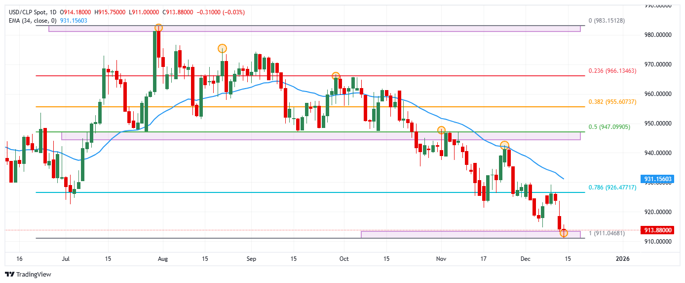 El USD/CLP marcó un máximo del día 915.75, donde atrajo vendedores agresivos que arrastraron la paridad a mínimos no vistos desde el 3 de octubre del 2024 en 911.00. En estos momentos, el USD/CLP cotiza en 913.88, cayendo un 0.03% en la última jornada de la semana.