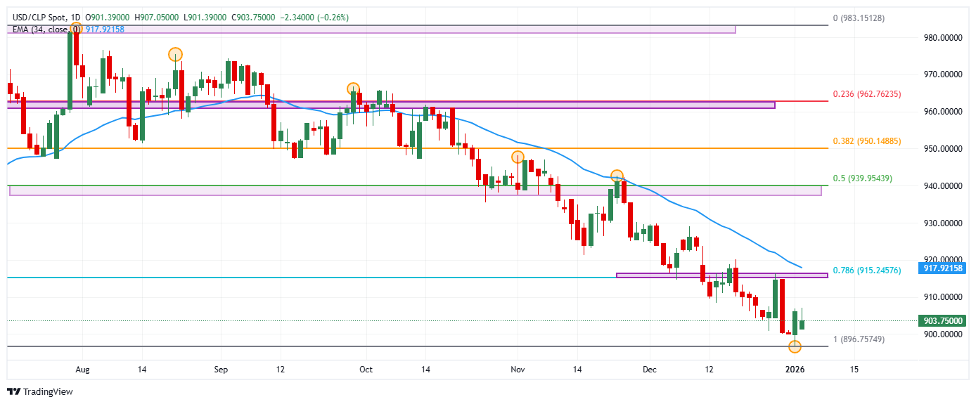 El USD/CLP reaccionó a la baja desde máximos del 30 de diciembre de 2025 en 907.05, donde encontró vendedores que llevaron la paridad a un mínimo diario en 901.39. Actualmente, el USD/CLP opera sobre 903.94, cayendo un 0.24% en el día.