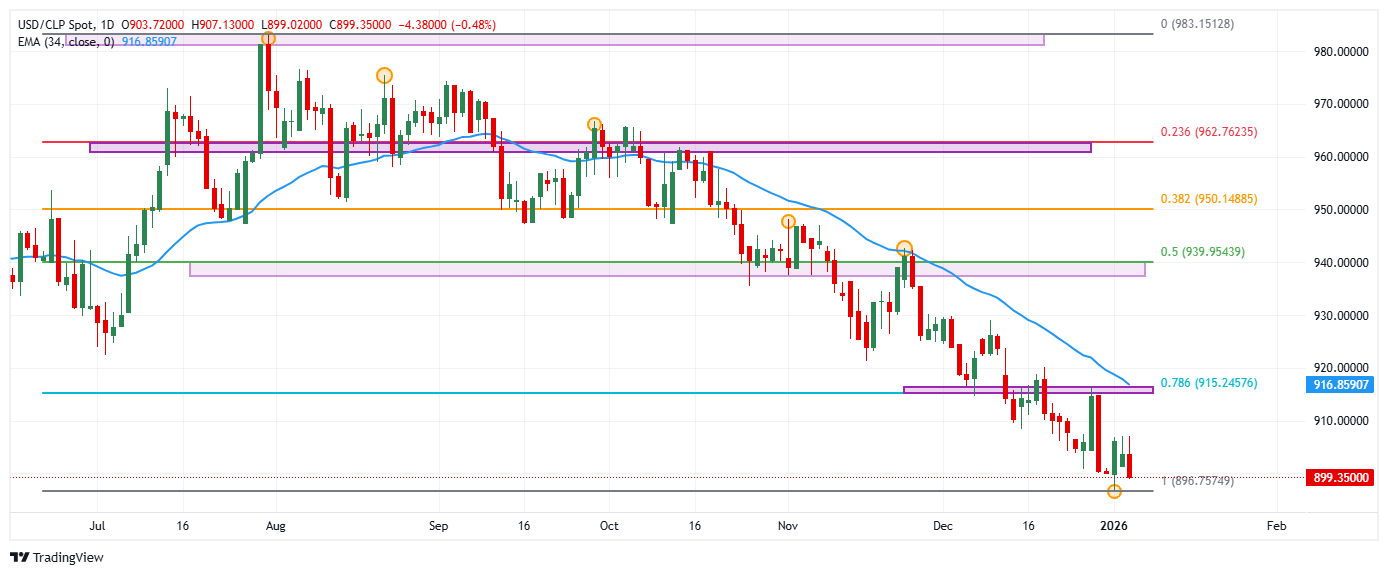 El USD/CLP estableció un máximo del día 907.13, atrayendo vendedores agresivos que arrastraron la paridad a mínimos de dos jornadas en 899.02. En estos momentos, el USD/CLP cotiza en 900.04, perdiendo un 0.41% diario.