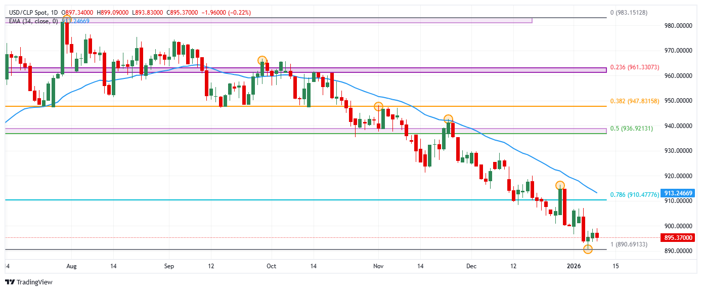 El USD/CLP reaccionó a la baja desde máximos del 6 de enero en 893.83, donde encontró vendedores que arrastraron paridad a un mínimo del día en 893.83. Al momento de escribir, el USD/CLP opera sobre 896.23, retrocediendo un 0.14% en la última jornada de la semana.