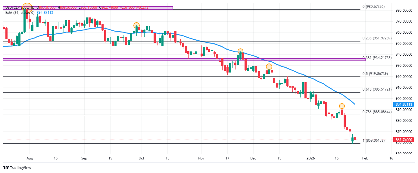 El USD/CLP reaccionó a la baja desde máximos del 23 de enero en 868.53, encontrando vendedores agresivos que llevaron la paridad a un mínimo del día en 860.15. En estos momentos, el USD/CLP cotiza en 863.04, perdiendo un 0.20% en el día.