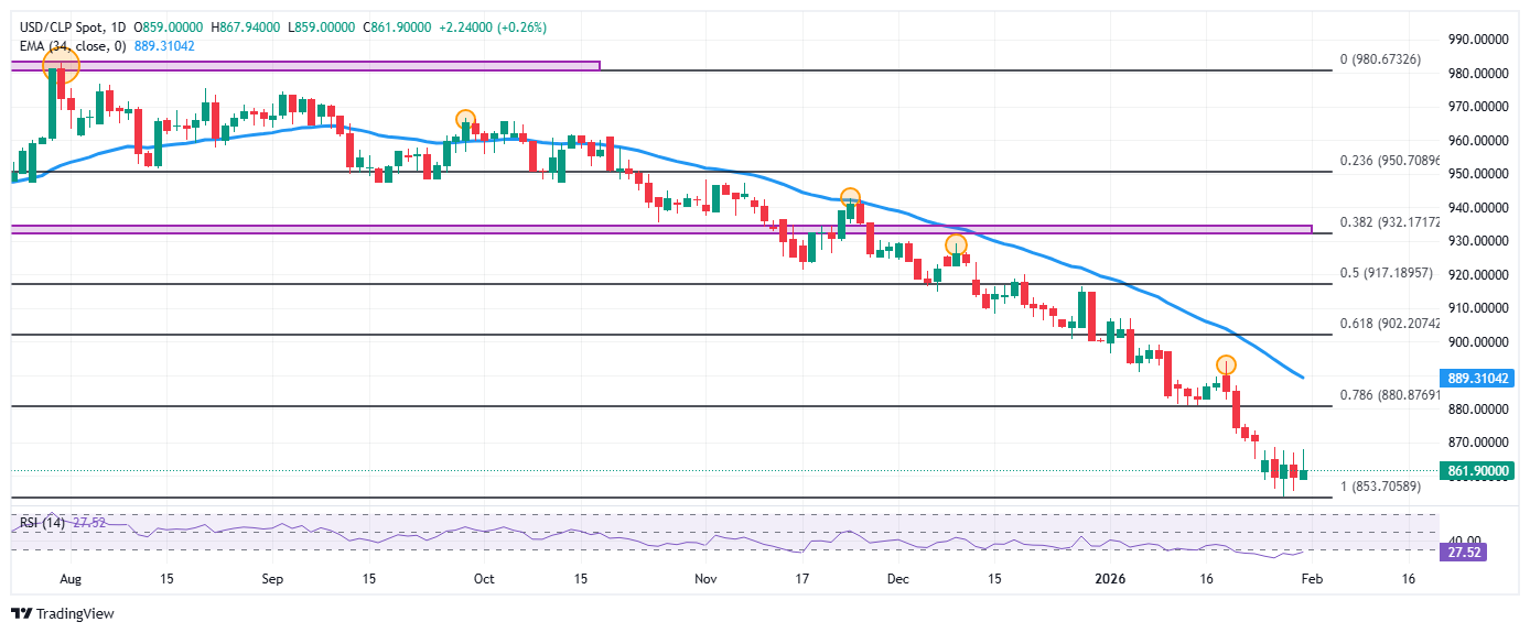 El USD/CLP marcó un mínimo del día en 859.00, donde atrajo compradores que impulsaron la paridad a máximos del 27 de enero en 867.94. En estos momentos, el USD/CLP opera sobre 862.11, ganando un 0.25% el día de hoy.