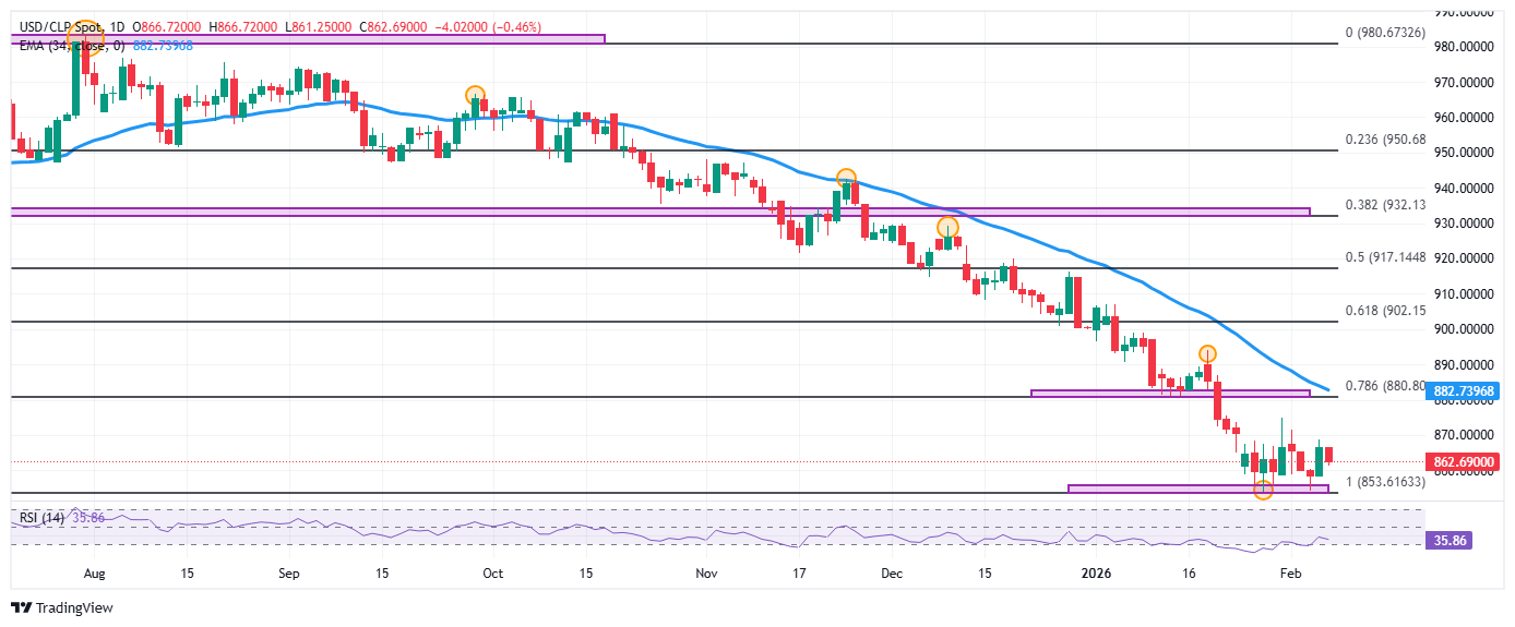 El USD/CLP marcó un máximo diario en 866.72, atrayendo vendedores que arrastraron la paridad a un mínimo del día en 861.25. Al momento de escribir, el USD/CLP cotiza en 862.68, cayendo un 0.45% en la última jornada de la semana.