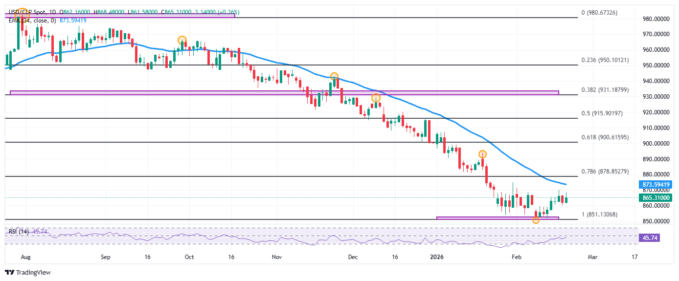 El USD/CLP estableció un mínimo diario en 861.58, atrayendo compradores que llevaron la paridad a máximos del 17 de febrero en 868.480 Al momento de escribir, el USD/CLP cotiza en 865.58, subiendo un 0.39% el día de hoy.