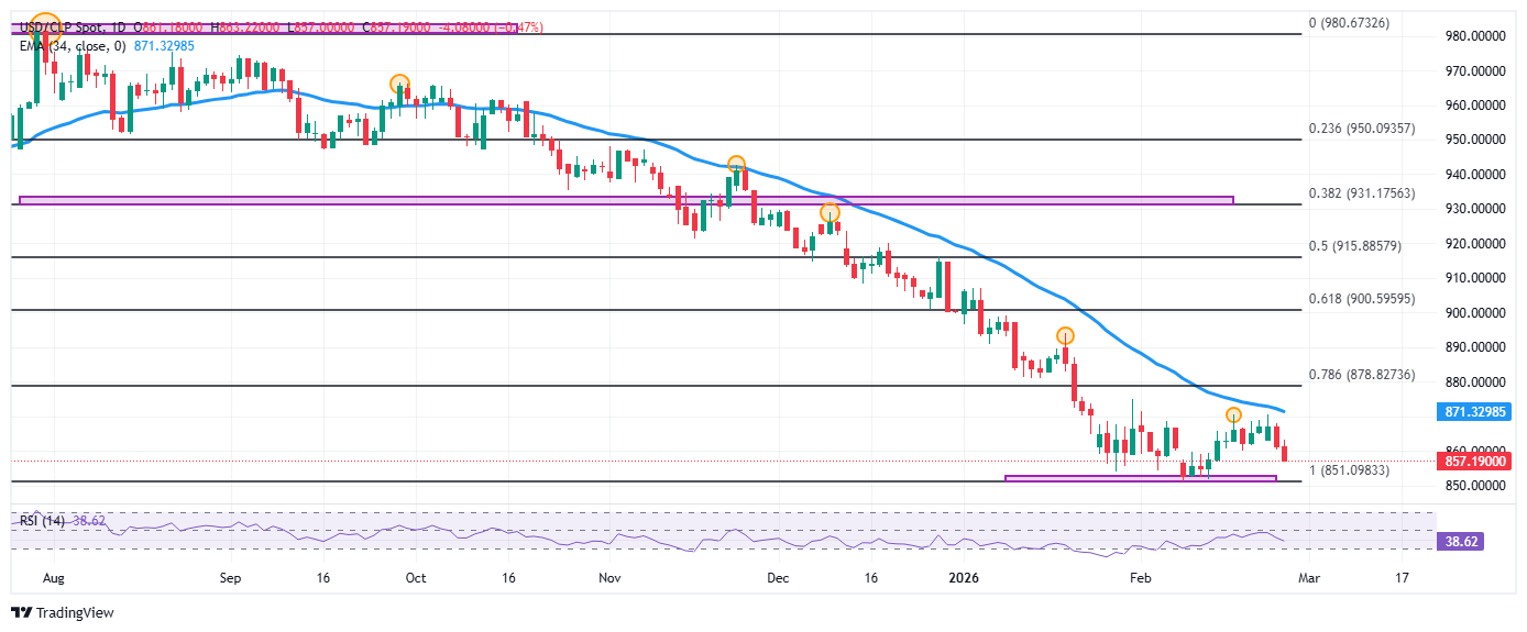 El USD/CLP registró un máximo del día en 863.22, atrayendo vendedores que arrastraron la paridad a mínimos del 13 de febrero en 857.00. En estos momentos, el USD/CLP cotiza en 859.96, cayendo un 0.32% el día de hoy.