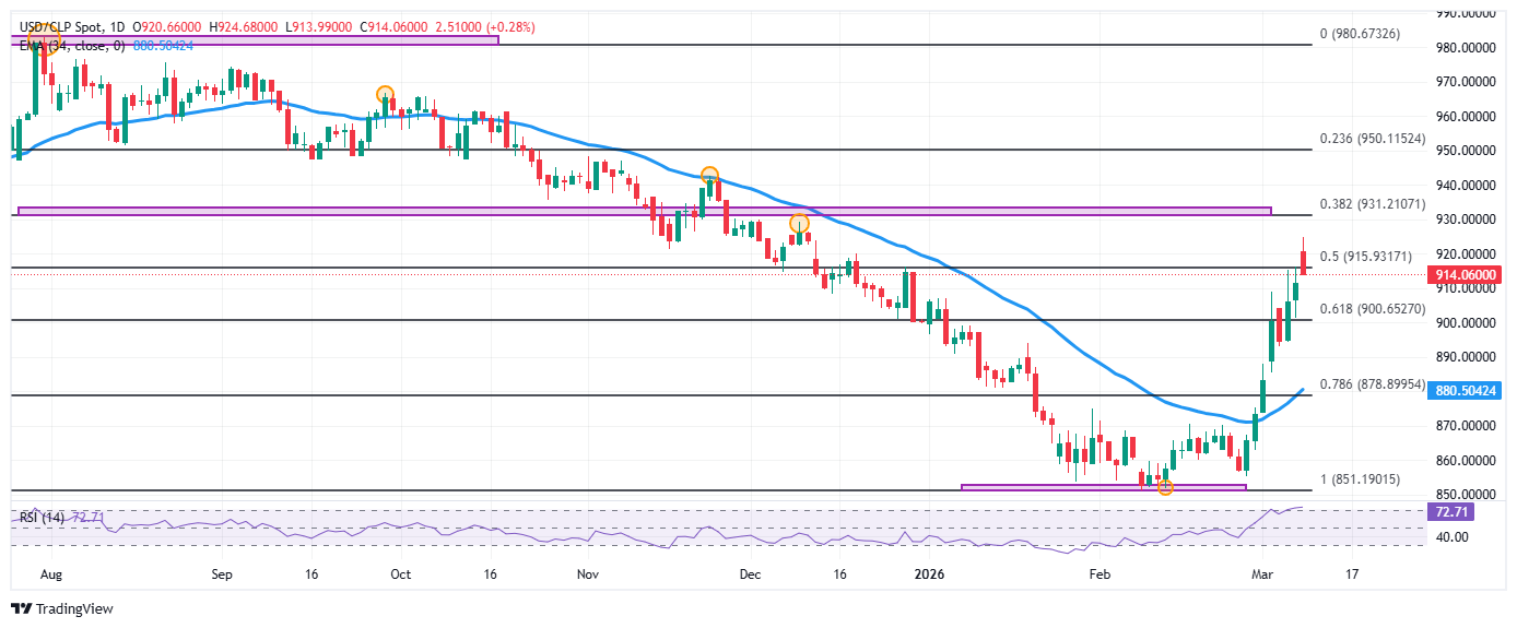 El USD/CLP estableció un mínimo del día en 914.00, atrayendo compradores que llevaron la paridad a máximos no vistos desde el 10 de diciembre de 2025 en 924.68. Actualmente, el USD/CLP cotiza sobre 915.88, subiendo un 0.47% diario.