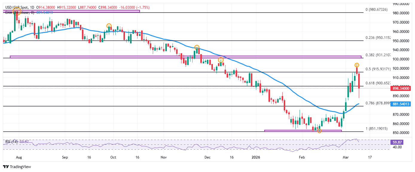 El USD/CLP reaccionó la baja desde un máximo diario en 915.32, encontrando vendedores agresivos que arrastraron la paridad a mínimos del 3 de marzo en 887.74. En estos momentos, el USD/CLP opera en 897.69, cayendo un 1.82% en el día.
