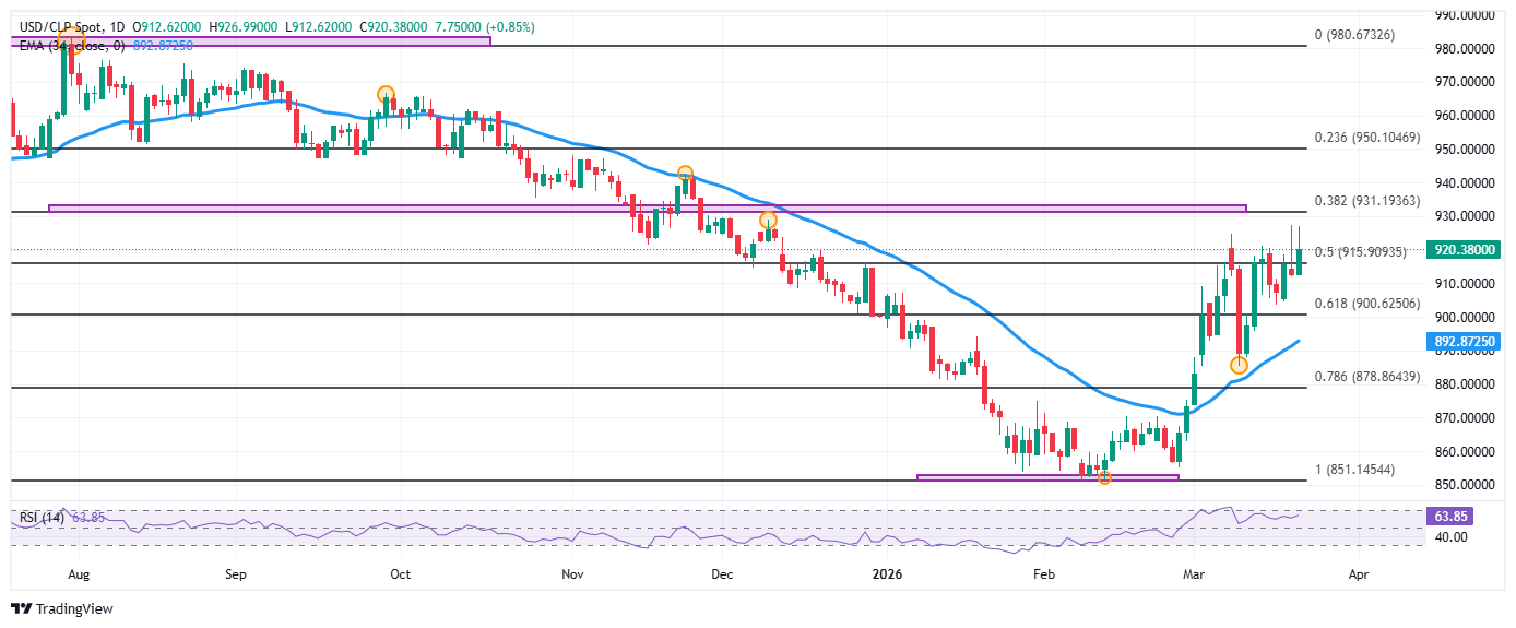 El USD/CLP estableció un soporte de corto plazo en 851.72, dado por el mínimo del 12 de febrero. Al alza, la resistencia más cercana a la observamos en 924.6, máximo del 9 de marzo. La siguiente resistencia clave se encuentra en 929.15, punto pivote del 9 de diciembre del 2025.