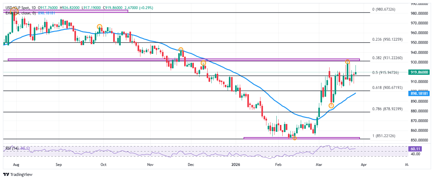 En este contexto, el Peso chileno cotiza en terreno negativo, en tanto que el USD/CLP avanza un 0.38% en la cuarta jornada de la semana, negociándose al momento de escribir sobre 919.91.