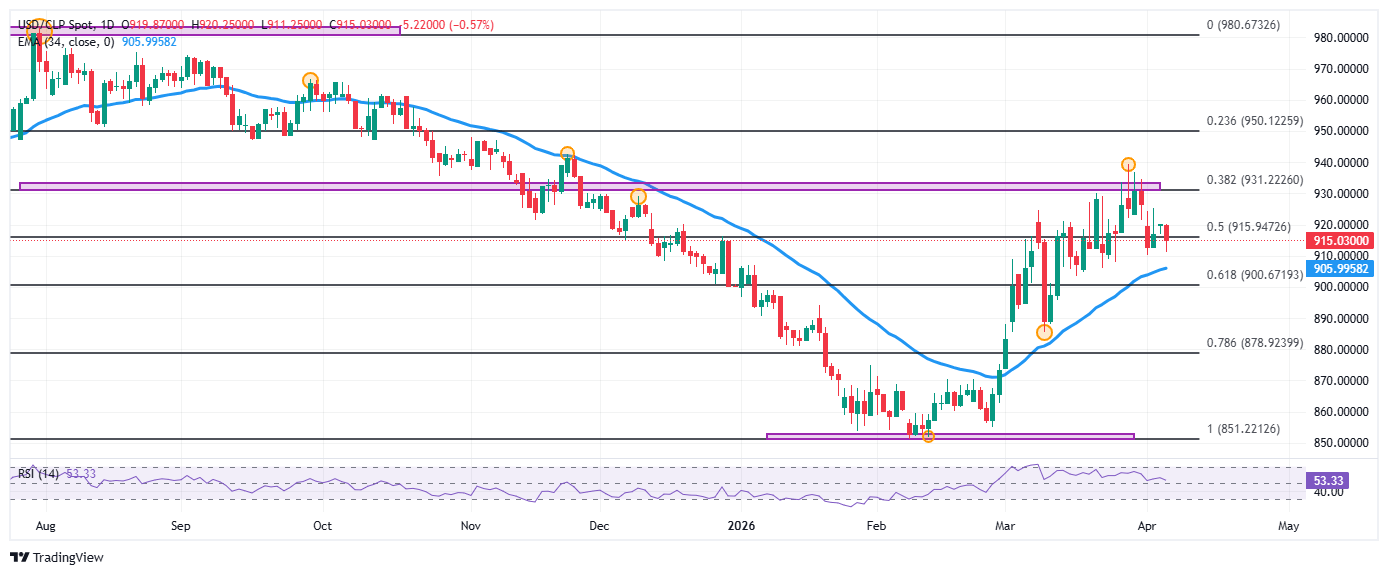 • El Dólar estadounidense se desliza frente al Peso chileno, alcanzando mínimos del 1 de abril en 911.25.