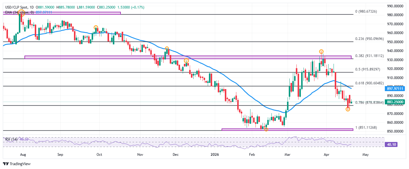 El Peso chileno extiende sus pérdidas el día de hoy, en tanto que el USD/CLP sube un 0.14% en la sesión del martes, cotizando actualmente en 883.14.