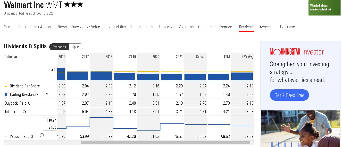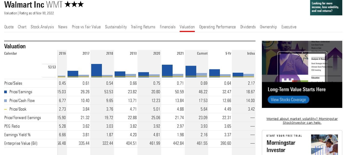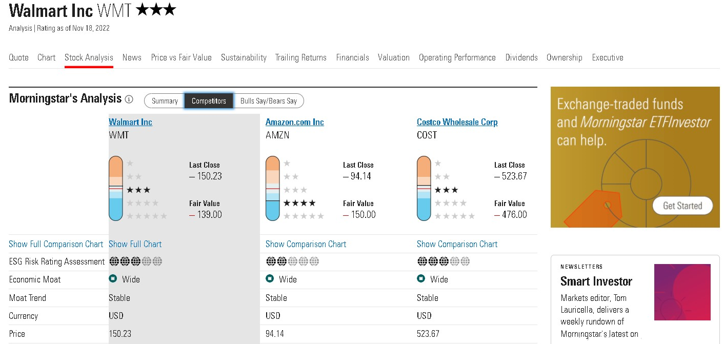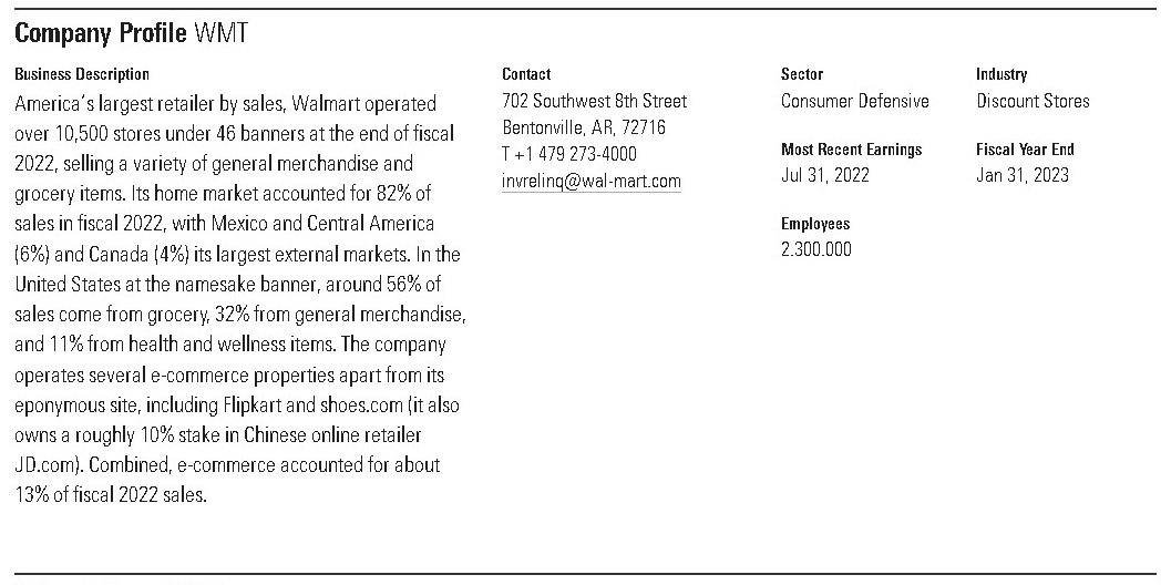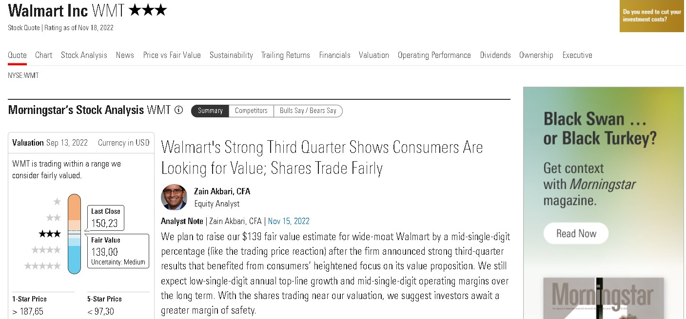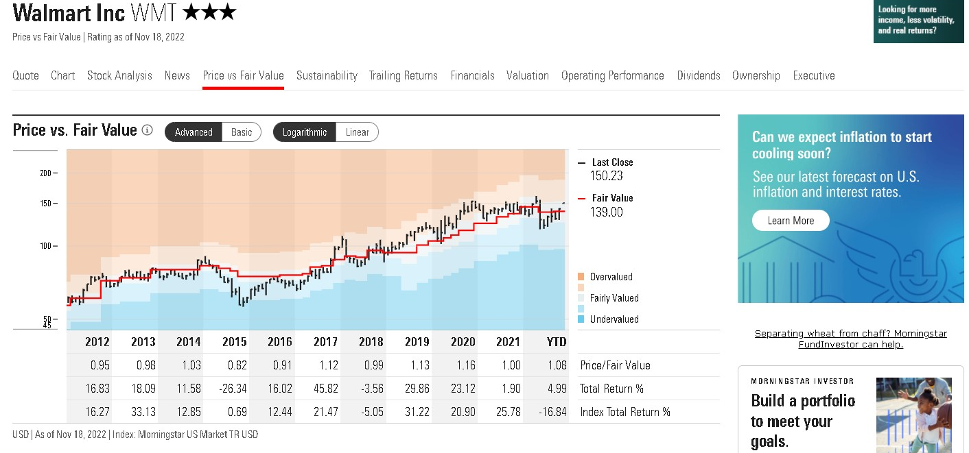 Zain Akbari, Equity Analyst para Morningstar, estima un valor intrínseco de 139 $ para Walmart. La cotización de mercado cerró en 150,23 $ para la sesión del 18 de noviembre de 2022. Por tanto, la acción se estaría comerciando con una prima de 8,1% sobre su valor intrínseco, dados los recientes buenos resultados.