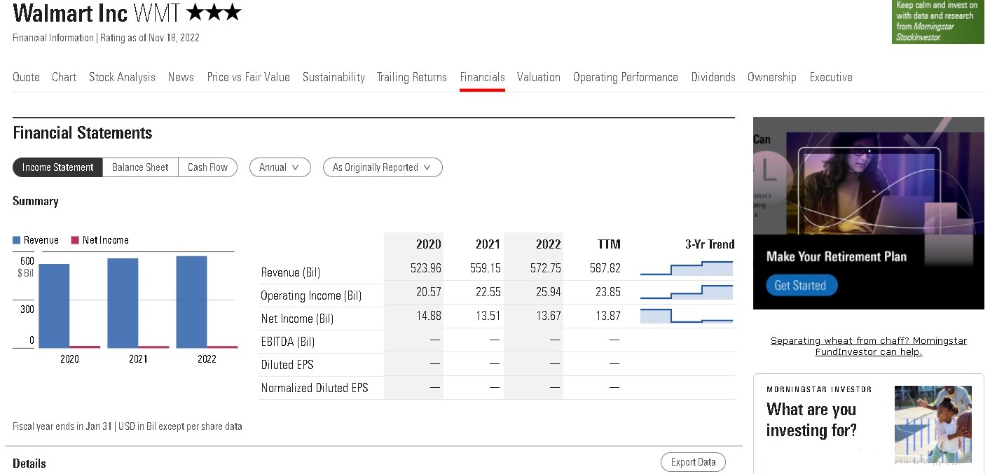 Para poder realizar el análisis cuantitativo debes extraer los estados financieros en Morningstar, en el link "Financials" del menú principal: