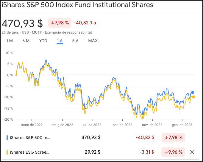 Si comparamos dos fondos de inversión, uno regular, es decir que no tiene en cuenta los criterios ESG y otro ESG podemos observar que las rentabilidades en 2022 del fondo ESG son significativamente inferiores a las de su homólogo no ESG debido a, como ya se mencionó, su alta exposición a las tecnológicas.