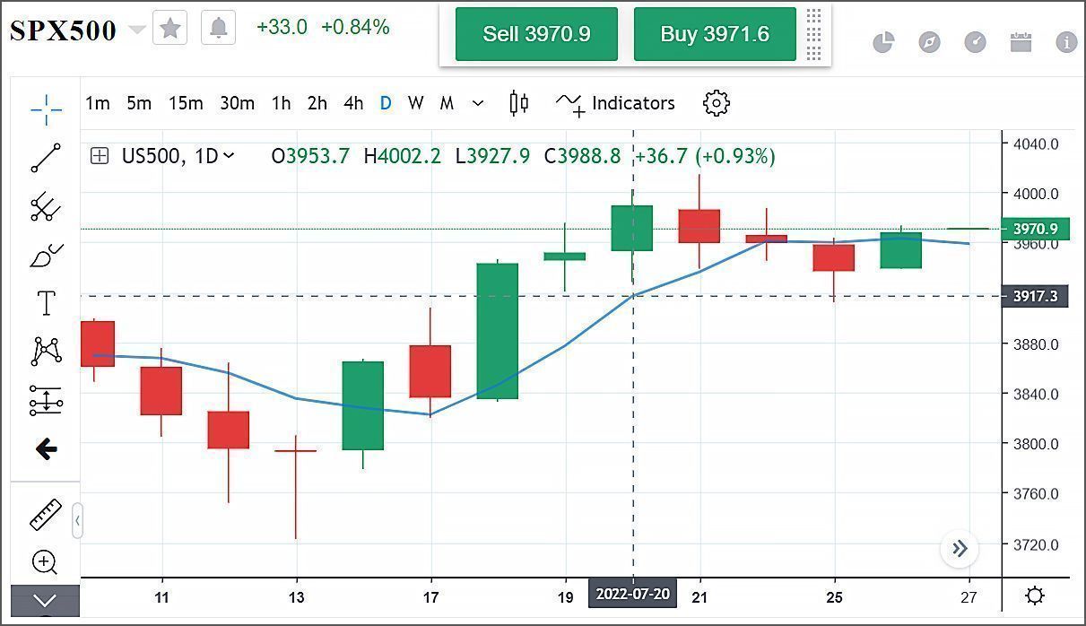 Cuando al indicador le configuras Length: 5, hace un promedio de los últimos 5 días para dar un precio, calculando la media del día 20/07/2022, tomamos los valores de cierre del 14, 17, 18, 19 y 20: 3864.7, 3836.5, 3943.1, 3952.1 y 3988.8, se suman y se dividen entre 5 y el resultado es 3917.04 que es el valor aproximado de la línea (MA).
